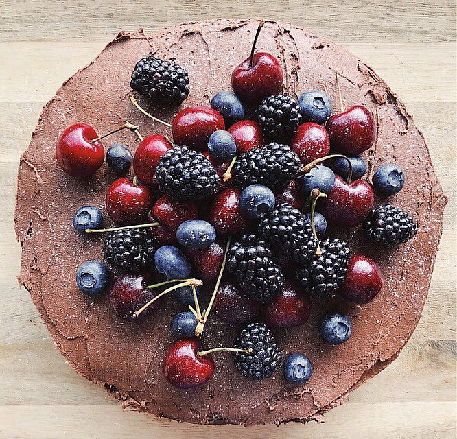 The recipe for this super yummy, vegan, chocolate cake can be found in the link below. I switched the frosting filling for raspberry jam and topped the cake with fruit covered in edible glitter.